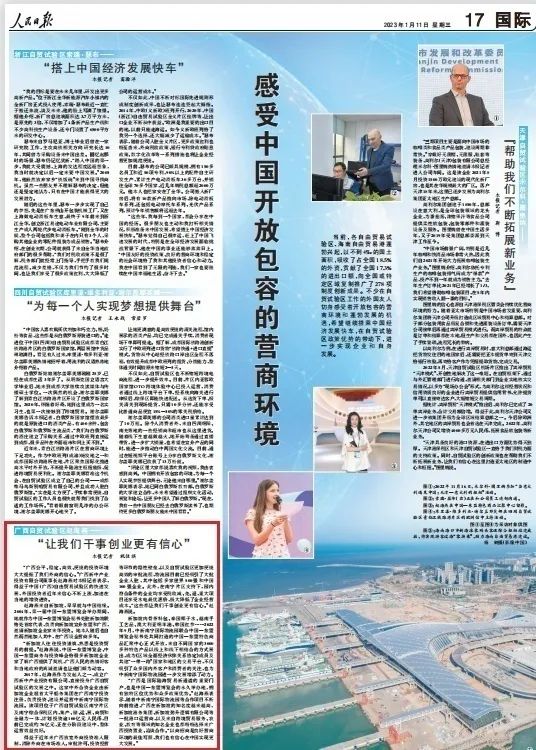 1月11日,《人民日?qǐng)?bào)》第17版刊登《感受中國(guó)開(kāi)放包容的營(yíng)商環(huán)境》的報(bào)道。得益于中國(guó)(廣西)自由貿(mào)易試驗(yàn)區(qū)的快速發(fā)展,外國(guó)投資者切身感受著開(kāi)放包容的營(yíng)商環(huán)境和蓬勃發(fā)展的機(jī)遇,加速在當(dāng)?shù)氐脑鲑Y進(jìn)資。其中采訪了廣西新中產(chǎn)業(yè)投資有限公司董事長(zhǎng)趙海燕,相關(guān)報(bào)道摘錄如下: