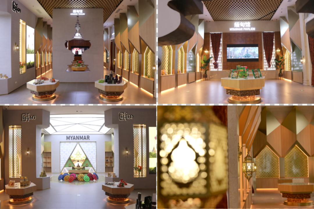 2021年,中新南寧國際物流園聯(lián)合中國—東盟博覽會秘書處共同打造了獨具特色的中國—東盟特色商品匯聚中心(以下簡稱“匯聚中心”)。其中,匯聚中心精心設(shè)計的緬甸館,以緬甸傳統(tǒng)特色文化為基調(diào),通過提取緬甸經(jīng)典的佛塔造型、翡翠色調(diào)、寶石切割面、漆器形狀等元素,結(jié)合緬甸風土人情,巧妙融合到設(shè)計之中,向公眾呈現(xiàn)一個“金色緬甸”的效果。自匯聚中心于2022年9月14日正式啟動以來,緬甸駐南寧總領(lǐng)事館總領(lǐng)事覺梭登就數(shù)次到訪匯聚中心,尤其對緬甸館能夠在有限的空間里充分展示緬甸多元文化與特色產(chǎn)品的設(shè)計理念感到極其認同。
